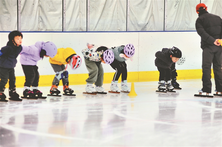 2日,哈爾濱市道里區(qū)冰上運動中心氣膜冰場內(nèi),百余名中小學生正在練習滑冰。