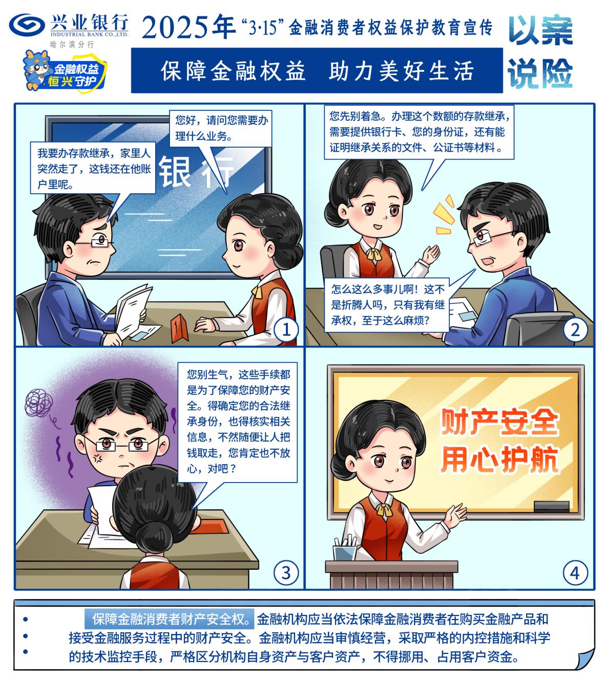 “保障金融權(quán)益 助力美好生活”,興業(yè)銀行哈爾濱分行2025年“3·15”金融消費者權(quán)益保護(hù)宣傳活動進(jìn)行中,本期向您介紹金融消費者八項權(quán)益中的財產(chǎn)安全權(quán)。