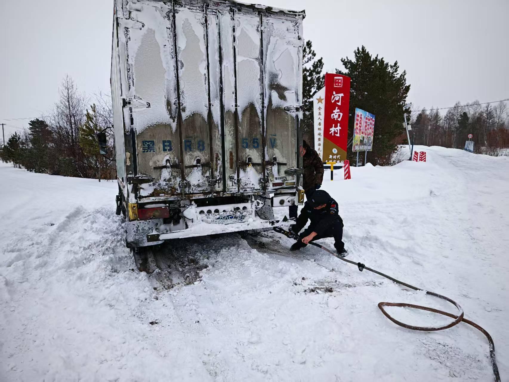 交警大隊(duì)接到G331國(guó)道河口執(zhí)勤點(diǎn)求助稱有一輛廂式貨車因積雪過厚、路面濕滑、不慎陷于深雪中無法移動(dòng),導(dǎo)致車輛被困。