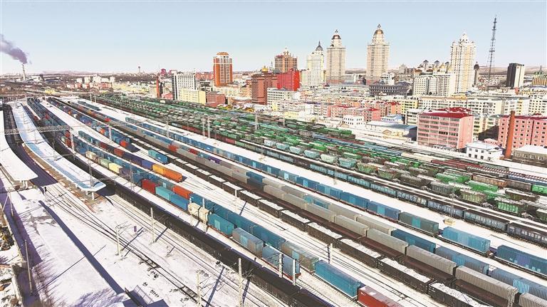 中歐班列在中國(guó)鐵路哈爾濱局集團(tuán)有限公司滿洲里站內(nèi)等待出境發(fā)車。黃旭攝